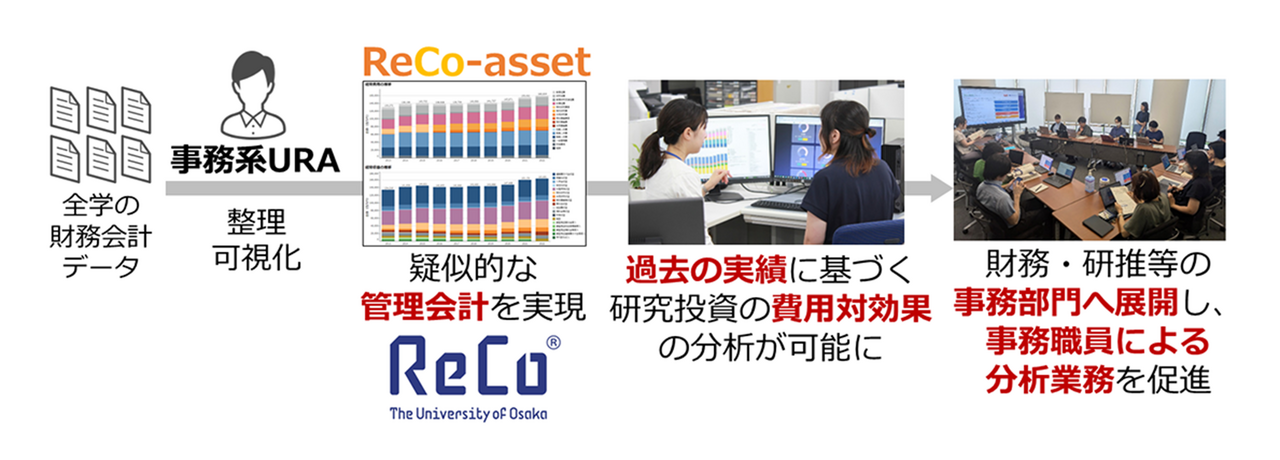 この財務データベース“ReCo-asset”は、財務の専門知識がなくとも操作することができ、執行部と部局との対話資料としても活用されています。また、データベースを経営企画オフィス内にとどめるのではなく、財務部や研究推進部、部局といった事務部門へも展開し、対話を通じてフィードバックさせ、 分析業務に役立ててもらおうとしています。